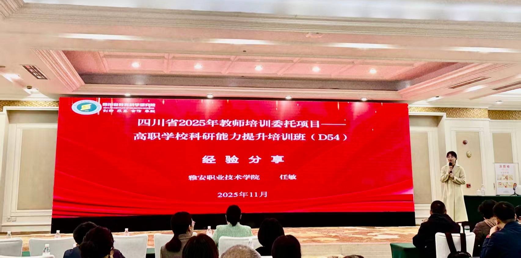2025年11月1日上午,由四川省教育科学研究院承办的“四川省2025年教师培训委托项目-高职学校科研能力提升培训(D54)”在成都举行结业仪式。雅安职业技术学院经济与管理学院院长、蒙顶山茶产业学院院长任敏,受组织方邀请安排,作题为“产业学院赋能地方区域产业发展-蒙顶山茶产业学院实例”的经验分享。参加此次会议的有四川省教育科学研究院的相关领导和专家,以及来自全省的四川省职业教育教学改革重大项目负责人或主研人员100人。